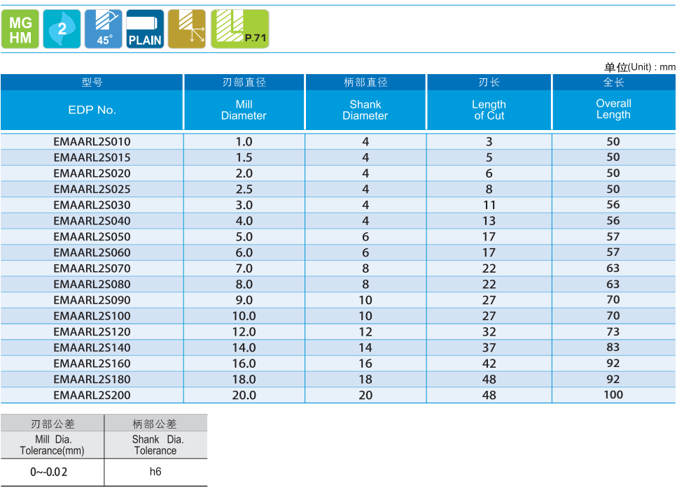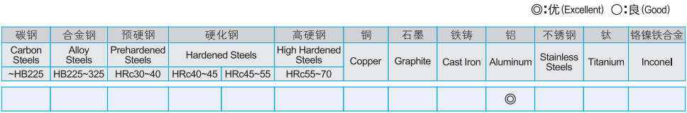 · 适用铝及合金材质加工 · 其他设计使振动较小化 · 镜面处理的切削刃可保证加工面的粗糙度 · 刃部直径公差精密化