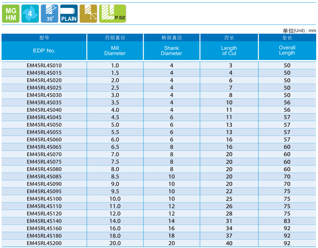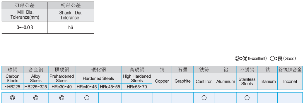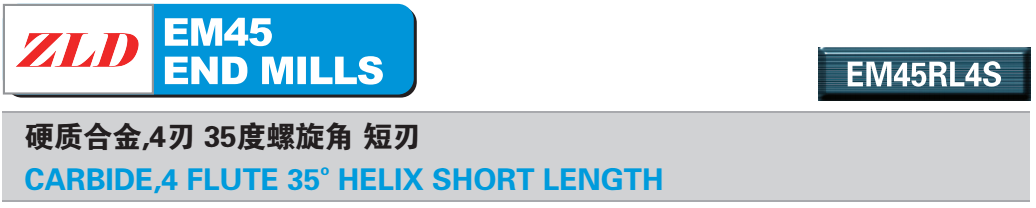· 设计用于加工碳钢,工具钢,钛合金,不锈钢等多种用途的钢 · 高耐磨性 · 4刃可得到较好的表面粗糙度 · 适应于高速加工,湿式和干