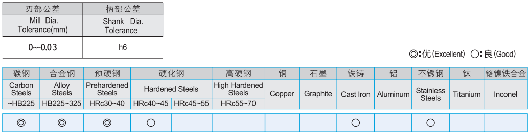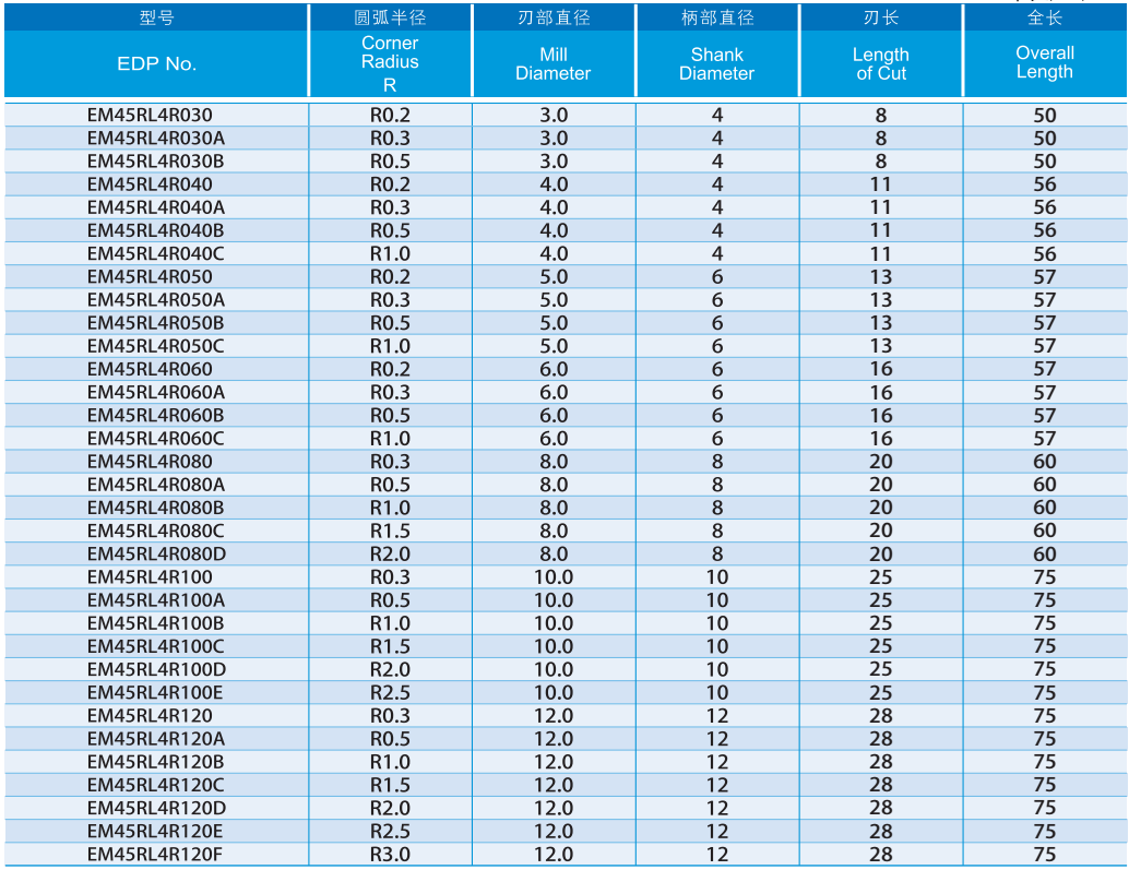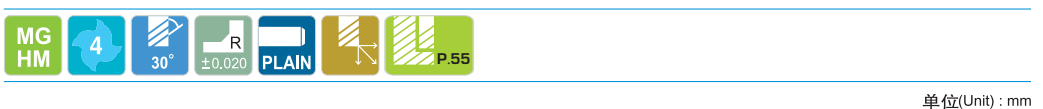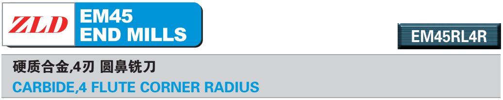 · 设计用于加工碳钢,工具钢,钛合金,不锈钢等多种用途的钢 · 高耐磨性 · 4刃可得到较好的表面粗糙度 ·